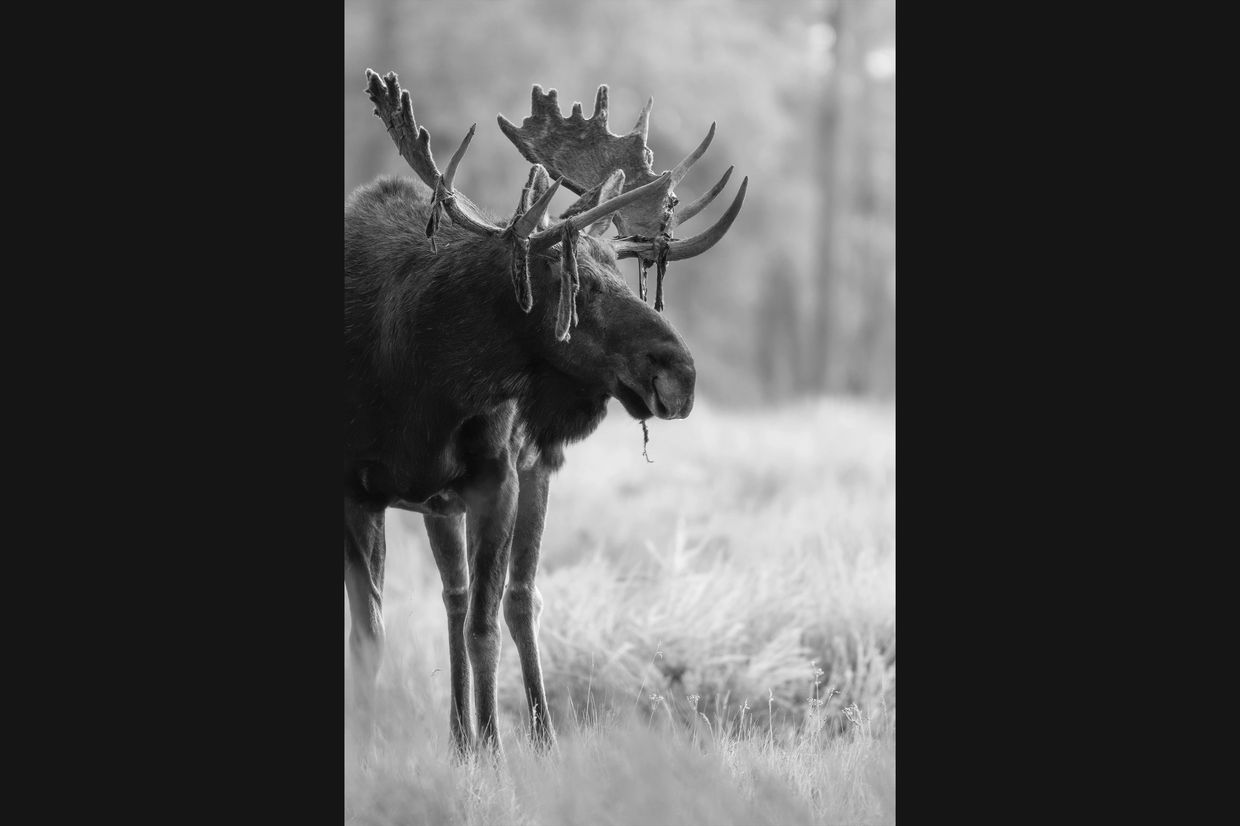Like blooming flowers of Spring or turning leaves of fall, nature’s patterns unfold in the alters of moose. In late summer they shed the fleshy velvet that provides nutrients necessary for to grown and maintain a new set of antlers every year. This short-lived lasting just a few days a year is seen here as this bull stands stoically among the approaching days of fall. (2025)