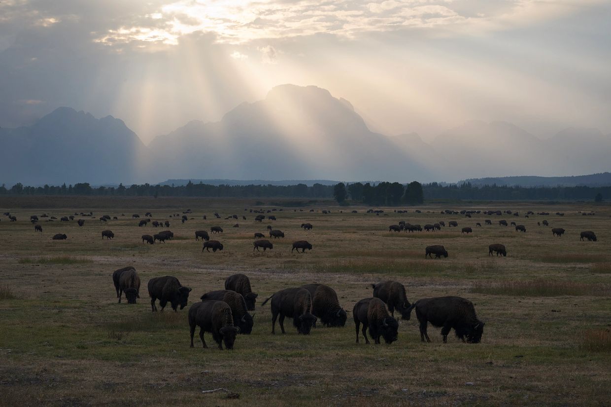 Over thousands of years, the North American Buffalo have endured intense weather extremes, the march of millennia, and near extinction. As rugged and dynamic as the illuminated landscape of the Tetons in this scene, they are inspiring symbols of America, endurance, strength and survival. (2025)