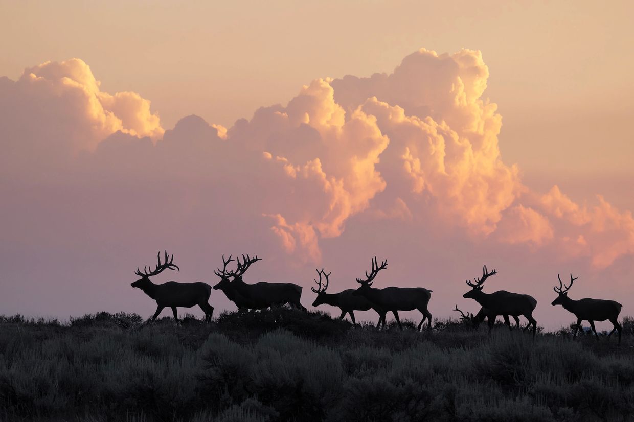 A herd of bachelor bull elk, 50-plus in nmber, made patterned caravans along this stretch in northwest Wyoming. Among them were the dominant alphas and their youthful followers that showcased the full hierarchy of their social ranks. On this morning, the bigger bulls leading the pack were set against the dramatics of a late summer sunrise, emphasizing their size, strength, and rightful place out front. (2025)